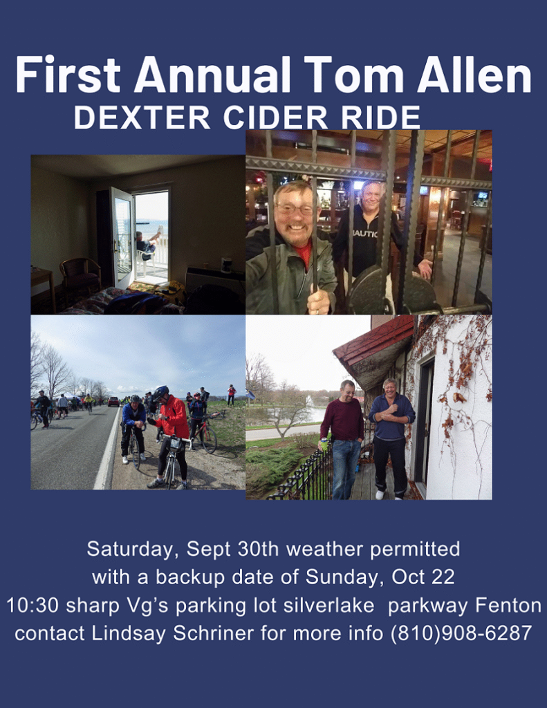 The first Annual Tom Allen Cider Ride will be a ride from Hudson Mills Metropark along the bike path to Dexter Cider Mill about 6 miles there and 6 miles back flat. It is more of a Social bike ride as I’m not as fast as I used to be. We will stop at the Cider mill for Cider and Donuts, ride back to Hudson Mills, and then go out to eat. We will either meet in Fenton in the VG’s parking lot to carpool down @ 10:30 or Meet down at Hudson Mills(8801 N Territorial Rd Dexter Mi 48130) around 11:20 am.