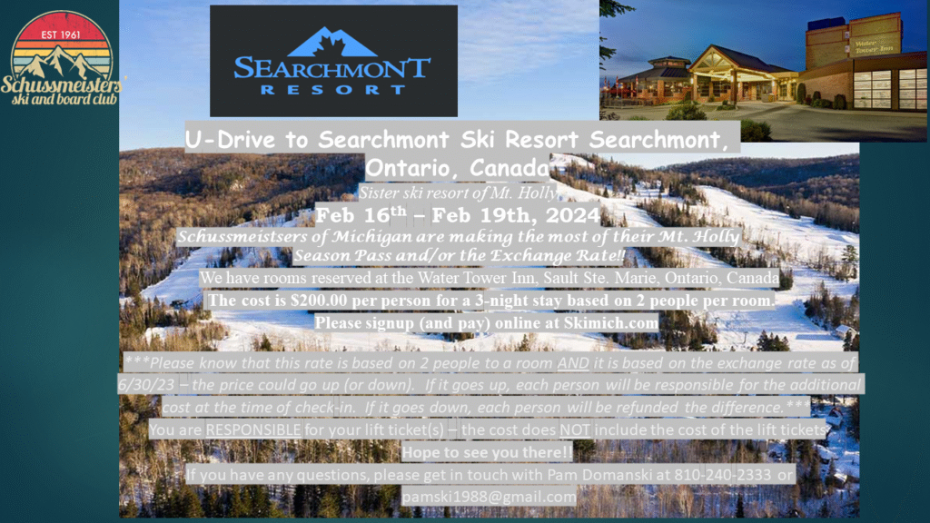 We will be skiing at Searchmont Ski Resort. You are responsible for your lift tickets. The room rate is for 3 nights, based on 2 to a room using exchange rate from 6/30/2023