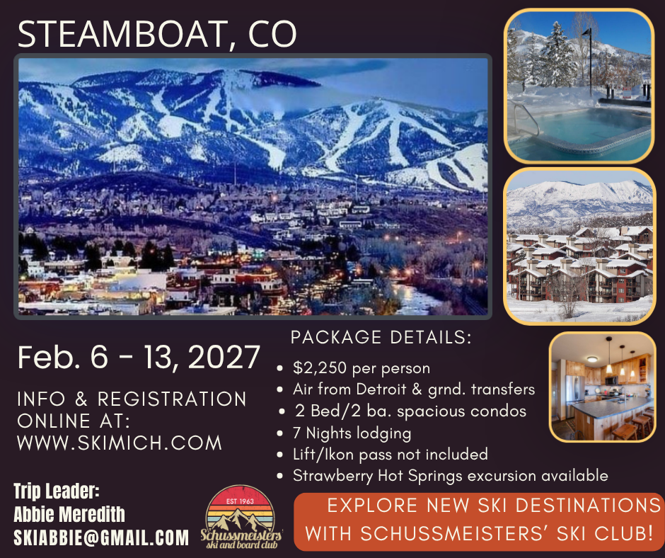 Social fun and mountain adventure! Staying at The Ranch, spacious multi-bedroom condos to gather, cook, and relax in front of the fireplace. The ski resort, with over 2,900 acres of terrain, 165+ trails, and a vertical drop of about 3,600 feet—offering something for every skill level and tree skiing in its famous Champagne Powder. Enjoy hitting the slopes together before winding down in the evenings with hot tubs, shared meals, and stories from the day. Round out the experience with a day trip to gorgeous Strawberry Park hot springs! 7 Nts. Lodging, air from DTW, ground transfer, club membership included. Lift ticket is not included, this is an Ikon resort.